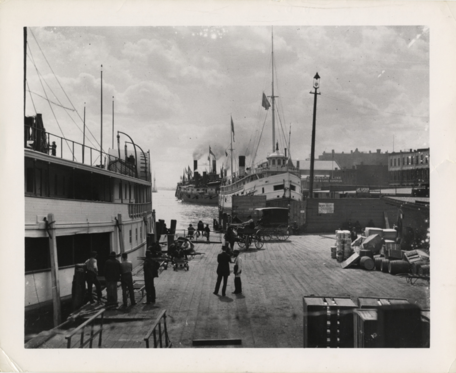 Favorite this☆ Detroit riverfront Description: View of Detroit riverfront. Ferries along waterfront; men stand on dock in foreground. Details Resource ID: bh007372 Subject: Waterfronts--Michigan--Detroit Ferries--Michigan--Detroit Docks--Michigan--Detroit Photographic prints Date Issued: Unknown year Format: 1 photographic print ; 8 x 10 in. Member of: Burton Historical Collection Filing Location: D/Riverfront Rights: Physical rights are retained by DPL. Copyright is retained in accordance with U.S. copyright laws.