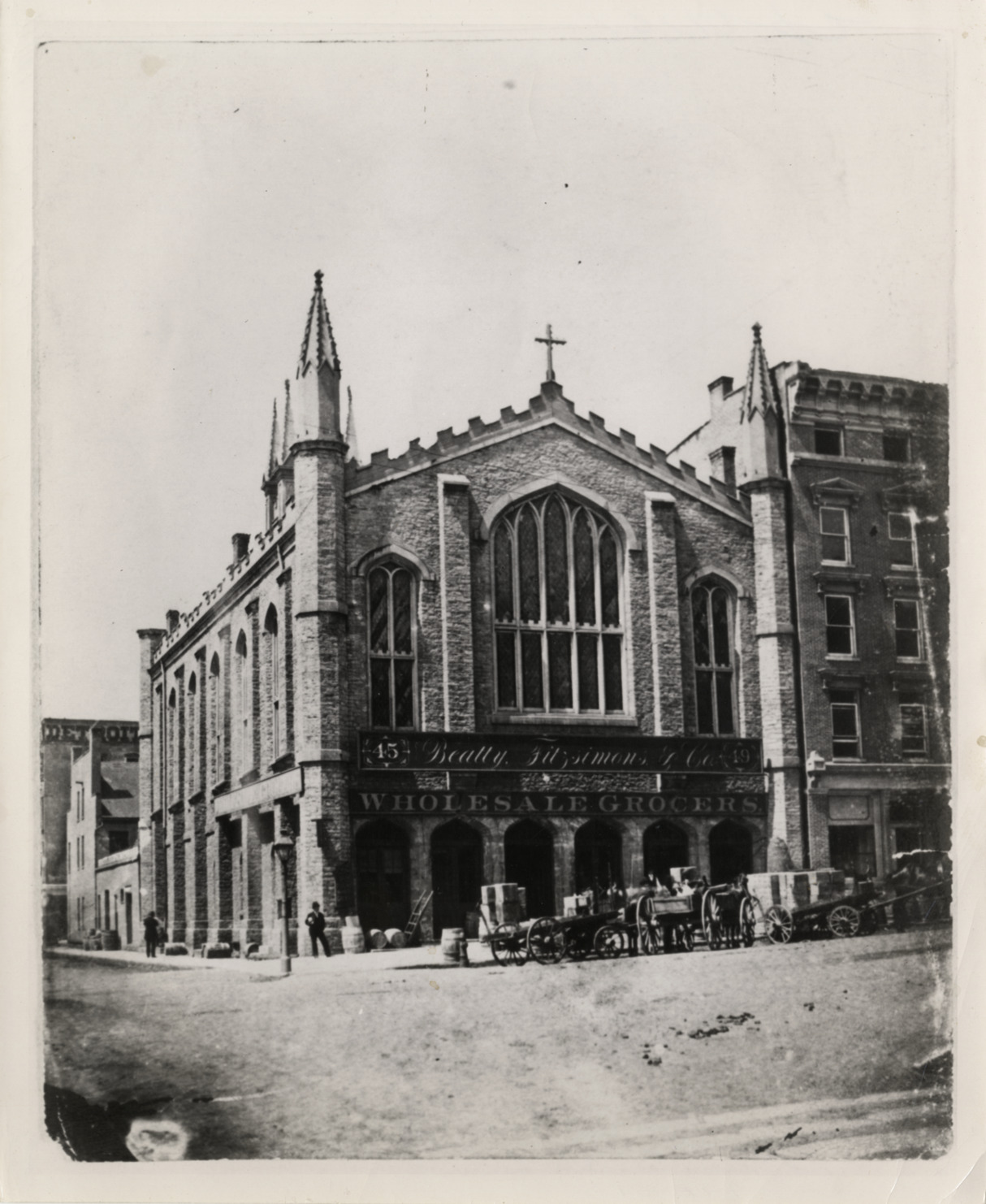 View of Mariners' Church with Beatty, Fitzsimons & Co. storefront. Horse-drawn wagons parked in front of building. Sign on church: "Beatty, Fitzsimons & Co. wholesale grocers." Handwritten on back: "Woodbridge & Woodward, erected 1849."