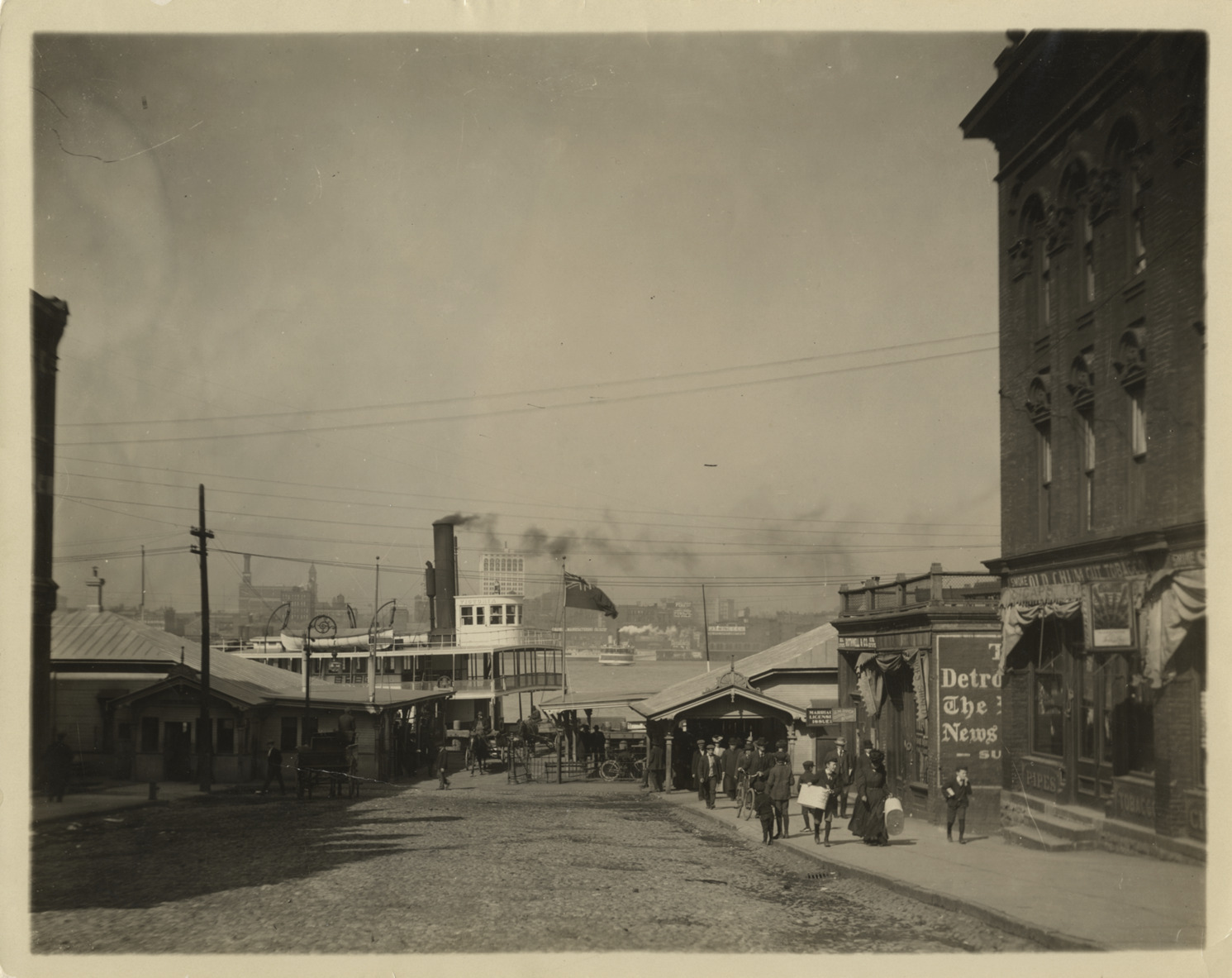View of ferry docked on Detroit River. Street and commercial buildings in foreground; pedestrians on sidewalk. Handwritten on back: "Ferry boat stopped at Ferry St.."
