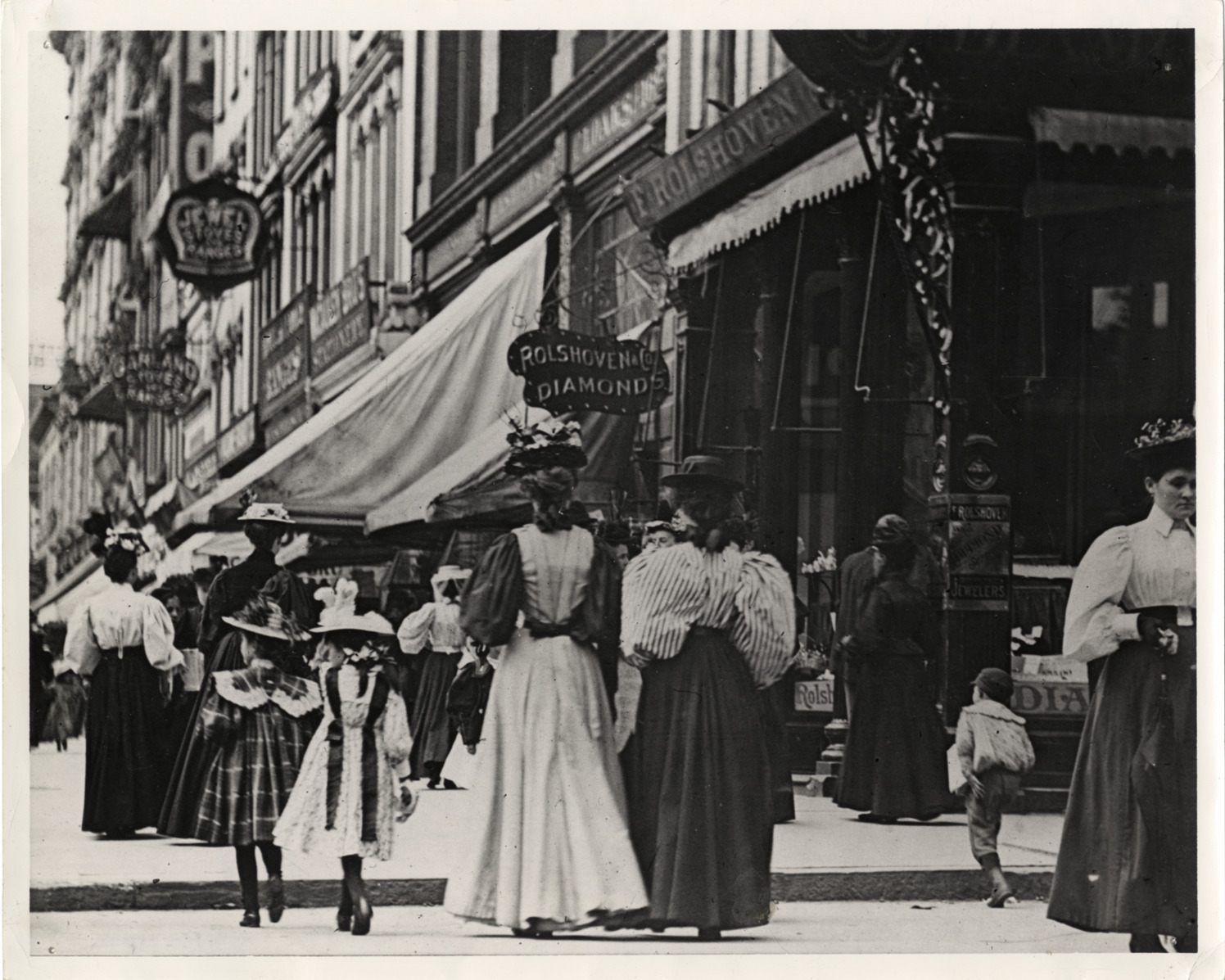 Favorite this☆ Woodward Avenue Description: View of pedestrians walking along Woodward Avenue. Rolshoven & Co. diamonds store on right. Handwritten on back: "ca. 1910, Jex Bardwell, glass neg., 1901-1910." Details Resource ID: bh007407 Creator: Bardwell, Jex, 1824-1902 Subject: Woodward Avenue (Mich.) Streets--Michigan--Detroit Women--Michigan--Detroit Jewelry stores--Michigan--Detroit Photographers--Michigan--Detroit Photographic prints Date Issued: 1910 (year approximate) Format: 1 photographic print ; 8 x 10 in. Member of: Burton Historical Collection Filing Location: D/Streets-Woodward Ave. Rights: Physical rights are retained by DPL. Copyright is retained in accordance with U.S. copyright laws.