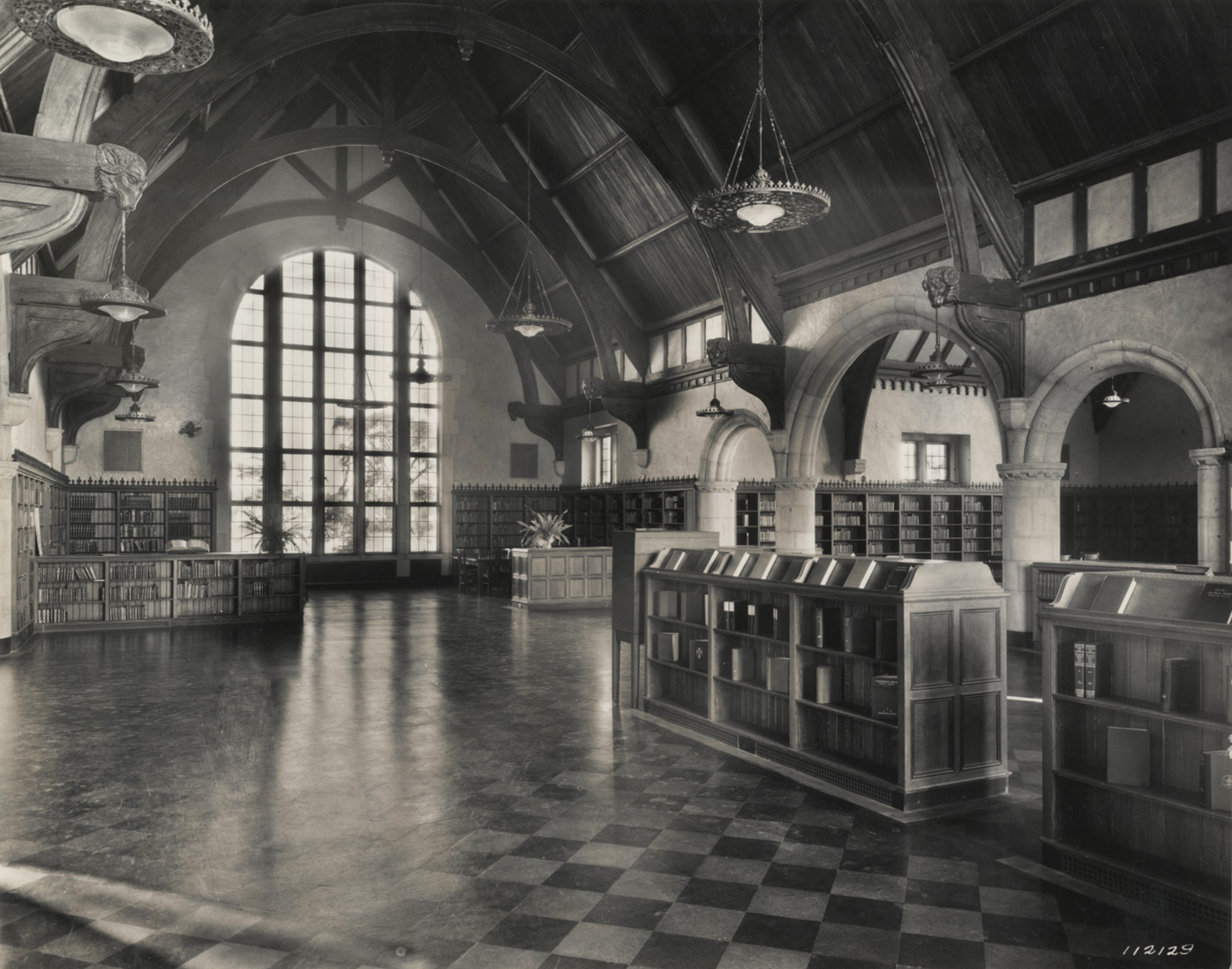 View of reading room of Parkman Branch Library, Detroit Public Library. Bookshelves in center of room and around perimeter of room; arched window in background. Typed on back: "Parkman Branch, non-fiction circulation showing reference at end and fiction on right." Handwritten on back: "Parkman Branch, Adult Room facing south, interior. Photo taken about 1931."