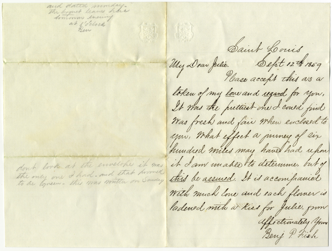 Favorite this☆ Letter to Julia Smith from Benjamin Fish Description: Letter to Julia Smith from Benjamin Fish expressing his love for her. Details Resource ID: bh007439 Creator: Fish, Benjamin P. Subject: Fish, Benjamin P.--Correspondence Fish, Julia Smith--Correspondence Smith, Isaac Sidmon, 1804-1886--Archives Date Issued: 1859-09-12 Format: 1 sheet ; 5.75 x 7.5 in. Member of: Burton Historical Collection Filing Location: MS/Smith, Isaac Sidmon, Box 1, Correspondence, 1833-1869 Rights: Physical rights are retained by DPL. Copyright is retained in accordance with U.S. copyright laws.
