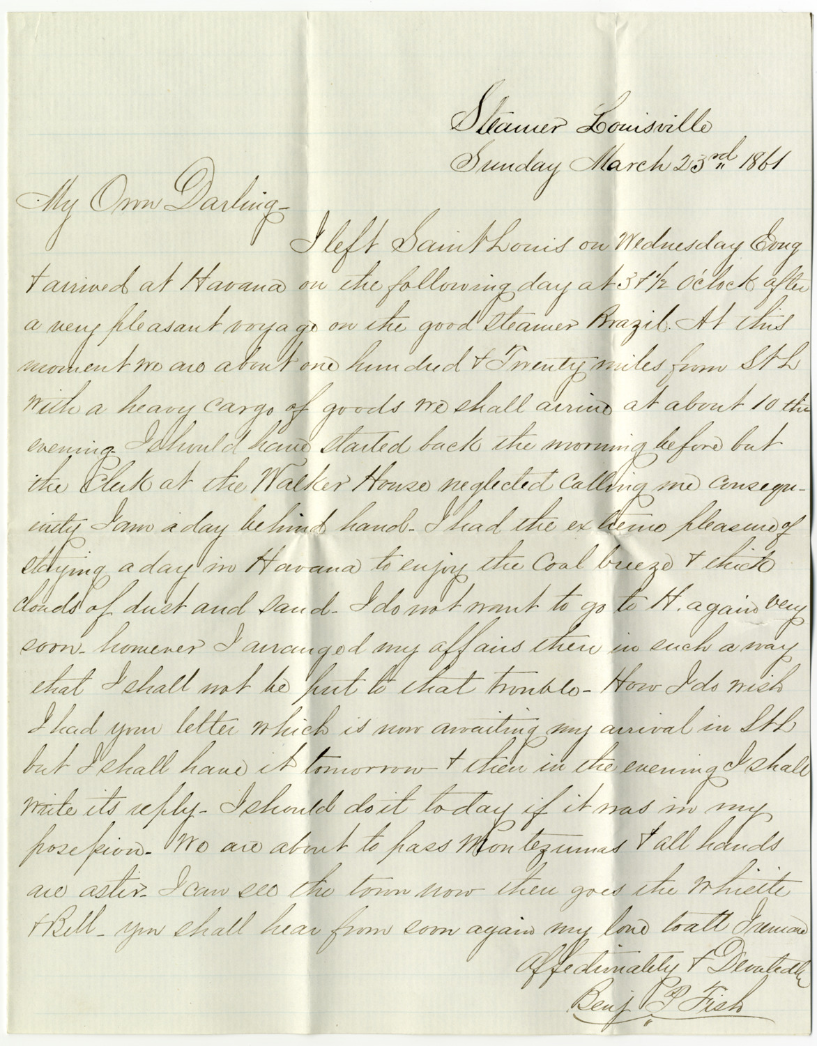 Favorite this☆ Letter to Julia Smith from Benjamin Fish Description: Letter to Julia Smith from Benjamin Fish describing his trip on the Mississippi River on the Steamboat Brazil, and business delays. Details Resource ID: bh007447 Creator: Fish, Benjamin P. Subject: Fish, Benjamin P.--Correspondence Fish, Julia Smith--Correspondence Mississippi River--Description and travel Smith, Isaac Sidmon, 1804-1886--Archives Date Issued: 1861-03-23 Format: 1 sheet ; 10 x 15.5 in. Member of: Burton Historical Collection Filing Location: MS/Smith, Isaac Sidmon, Box 1, Correspondence, 1833-1869 Rights: Physical rights are retained by DPL. Copyright is retained in accordance with U.S. copyright laws.