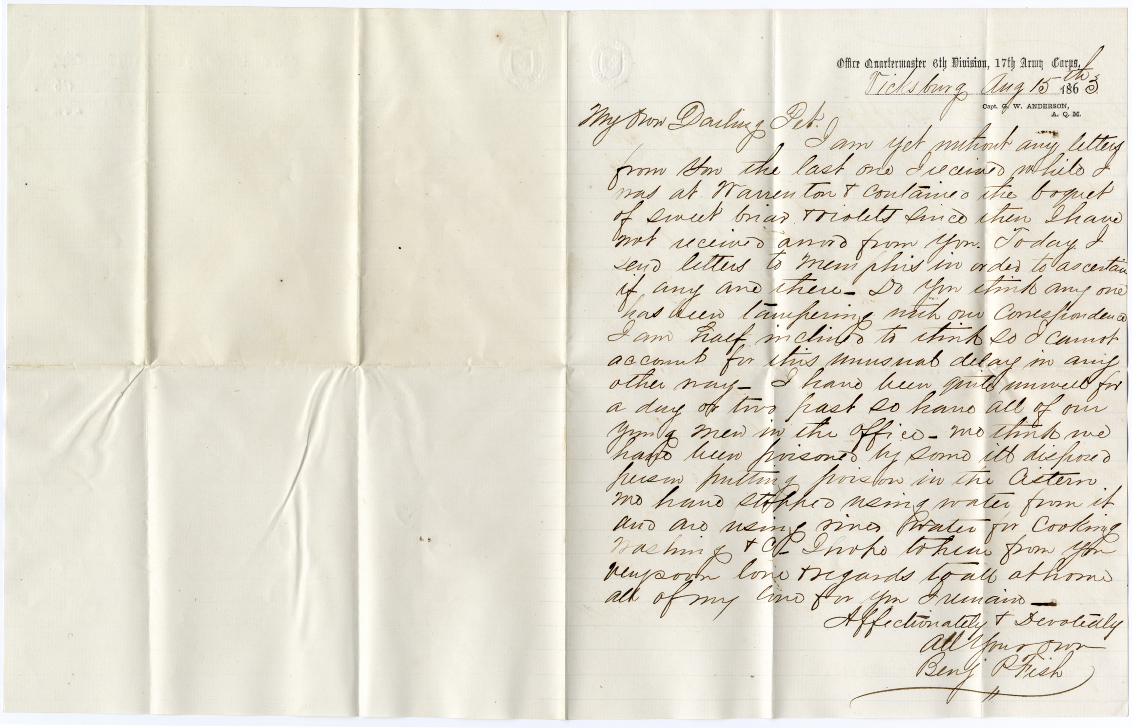 Favorite this☆ Letter to Julia Smith from Benjamin Fish Description: Letter to Julia Smith from Benjamin Fish written during the Civil War. Printed on front: "Officer Quartermaster 5th Division, 17th Army Corps, Capt. G. W. Anderson, A. Q. M." Details Resource ID: bh007485 Creator: Fish, Benjamin P. Subject: Fish, Benjamin P.--Correspondence Fish, Julia Smith--Correspondence United States--History--Civil War, 1861-1865 Smith, Isaac Sidmon, 1804-1886--Archives Date Issued: 1863-08-15 Format: 1 sheet ; 9.75 x 15.5 in. Member of: Burton Historical Collection Filing Location: MS/Smith, Isaac Sidmon, Box 1, Correspondence, 1833-1869 Rights: Physical rights are retained by DPL. Copyright is retained in accordance with U.S. copyright laws.