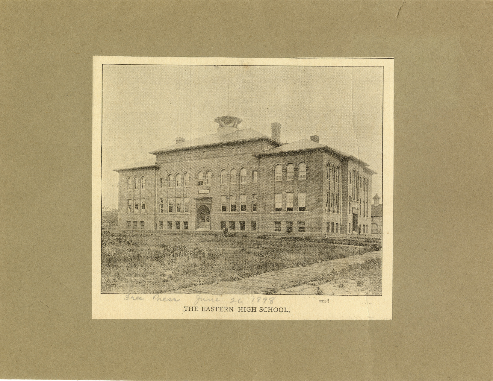 View of Eastern High School. Printed on front: "The Eastern High School." Handwritten on front: "Free Press, June 26, 1898." Printed on back: "Eastern High School. The Eastern high school is better known as the Harris school. It is situated on Pulford and Ellery streets, and was built in 1896 at a cost of $33,600. The names of the teachers at this school are: Spencer Levant Houghton, principal, chemistry and physics; Edith Ellen Pettee, geography, physiology, zoology; Alice Elizabeth Lynch, English, German, rhetoric; Isabelle Hosje, English and Latin."