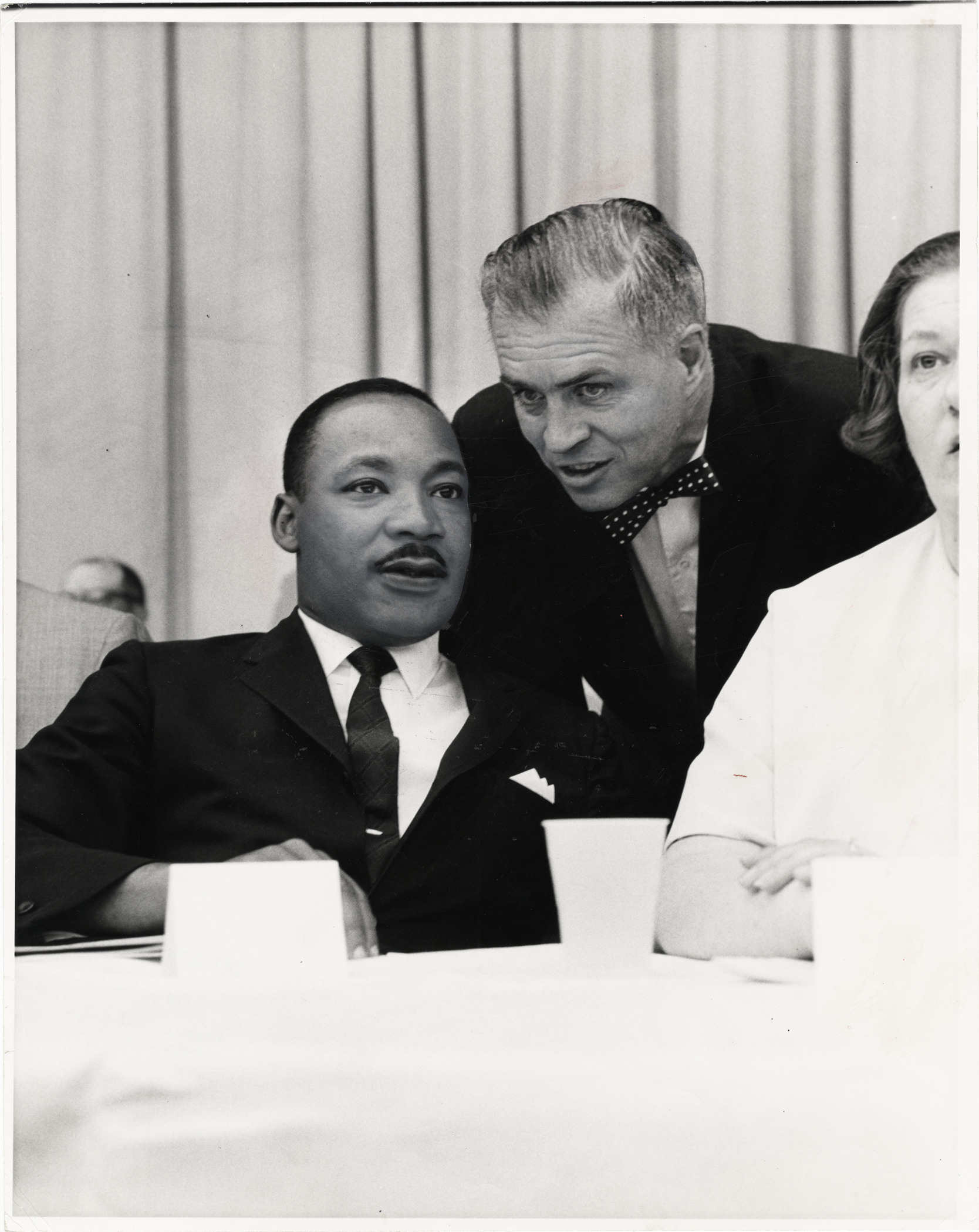 View of Dr. Martin Luther King, Jr. and G. Mennen Williams at N.A.A.C.P. Freedom Rally. Handwritten on back: "N.A.A.C.P. Rally, Freedom Rallies. L., Dr. Martin Luther King; R., G. Mennen Williams. Mary Sheffield, next to Gov. Williams." Label on back: "Dr. King and Soapy Williams put heads together." Stamped on back: "Detroit Free Press, Jun 19, 1966. Photo by Witek."