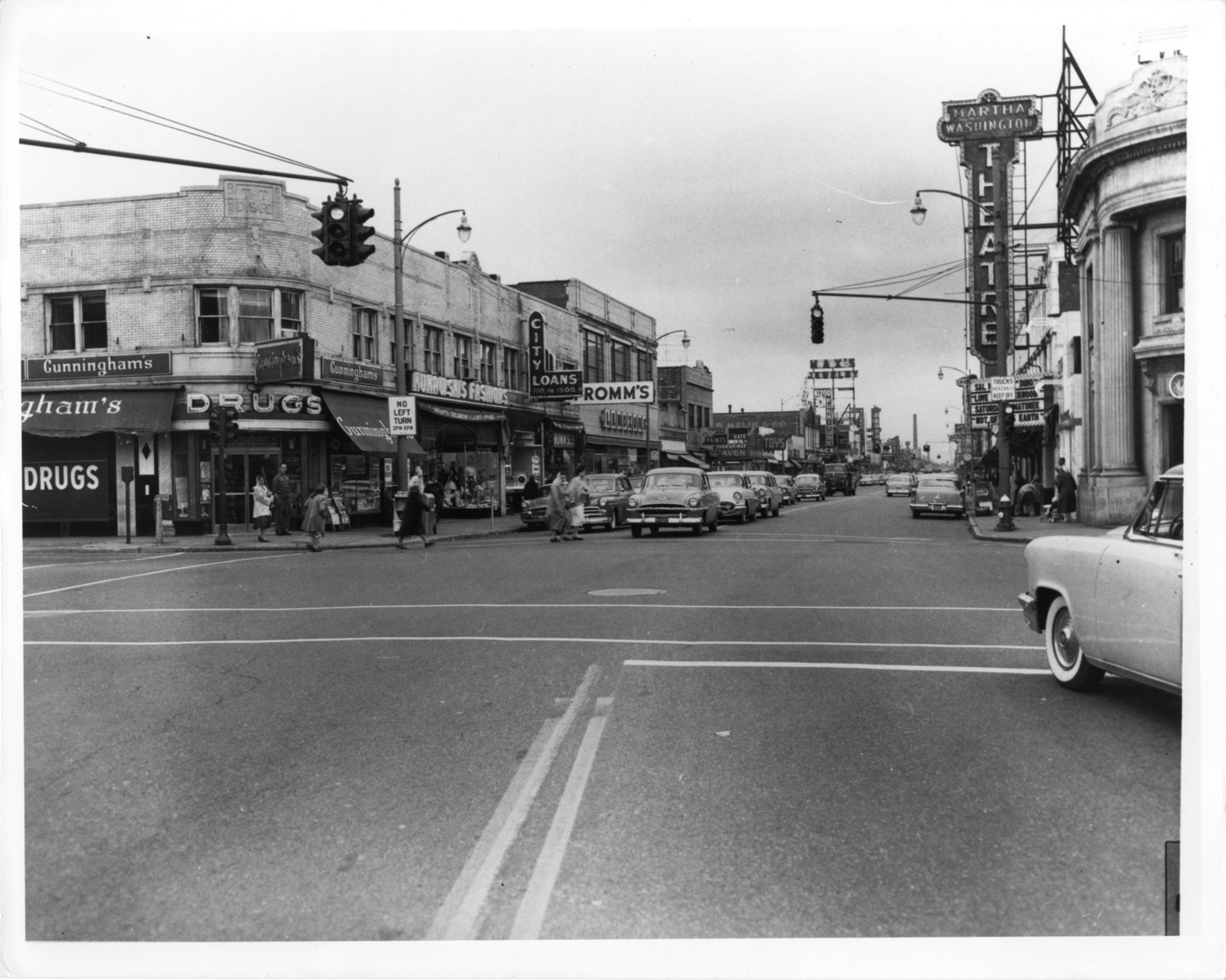 View of intersection of Caniff and Joseph Campau Streets in Hamtramck, Michigan. Martha Washington Theatre sign on right; Cunningham's Drugs store on opposite corner. Handwritten on back: "Joseph Campau & Caniff (looking south)."