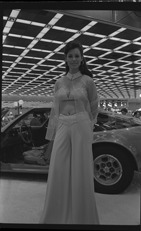 Portrait of a woman standing in front of car at the Detroit Auto Show.