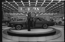 View of a woman, wearing long dress, standing next to Pontiac car on a circular platform at the Detroit Auto Show. "Pontiac" sign displayed in background.
