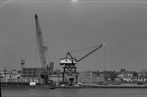 View of cranes near the Detroit River in southwest Detroit. Industrial buildings, Hotel Yorba and water tower in background.
