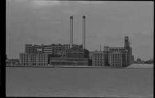 View of factory buildings at the edge of the Detroit River.