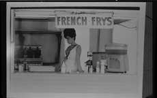 View of woman standing behind counter at refreshment stand at Bob-Lo Amusement Park. "French frys" sign displayed over counter; beverage dispenser on right.