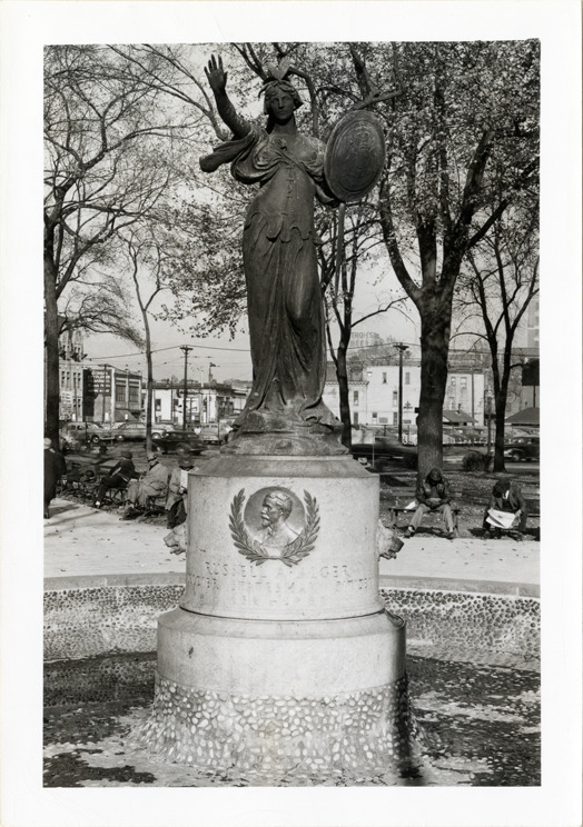 View of the Russell A. Alger Memorial Fountain, located in Grand Circus Park. "Russell A. Alger, soldier, statesman, citizen, 1836-1907" inscribed on base. Fountain was designed by Daniel Chester French.