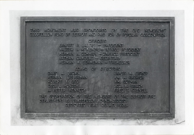 View of plaque on back of monument dedicated on June 23, 1928 to James J. Brady, founder of the Old Newsboys Association, located on Belle Isle at Central and Inselruhe Avenues. Monument was designed by Samuel A. Cashwan and Fred O'Dell. Inscription reads: "This monument was sponsored by the Old Newsboys Goodfellow Fund of Detroit and paid for by popular subscription. Officers: Ernest P. LaJoie, president; Walter I. McKenzie, 1st Vice President; Herman A. Schmier, 2nd Vice President; Nathan Samuels, Secretary; Herman W. Schmem, Treasurer. Board of Directors: David A. Borwn, James W. Bishop, Herman Lieberman, Wm. A. Parris, Robert Y. Ogg, Wm. Gutman, Geo. J. Hunter, Jos. W. Brady, A. Peter Kennedy, Fred T. Grenell. The cooperation of the members of the Detroit Fire Department is gratefully acknowledged, dedicated June 23, 1928."