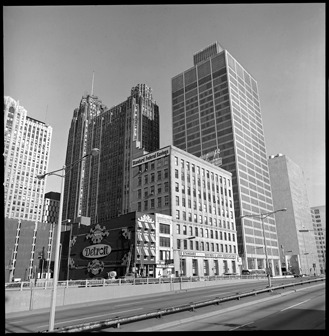 View of Guardian Building, Michigan Consolidated Gas Company and Standard Federal Savings from Jefferson Avenue. "Detroit" painted on brick wall.
