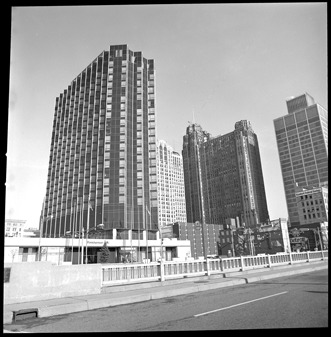 View of Pontchartrain Hotel, designed by King and Lewis in 1965. Buhl Building, Michigan Consolidated Gas Company and Guardian Building in background.