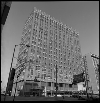View of National Bank of Detroit building. "Luigi's Pizzeria" sign in foreground.