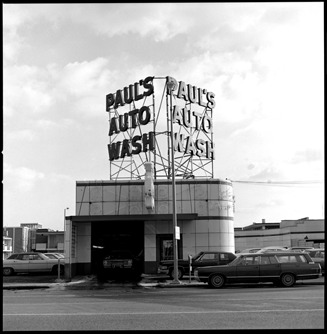 View of automobiles and station wagon parked in front of Paul's Auto Wash.