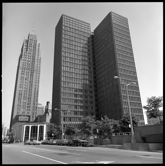 View of the First Federal Bank Building and David Stott building. Greenfield's Restaurant in background.
