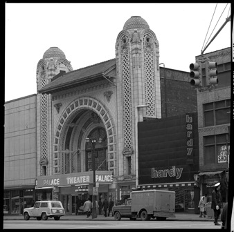 View of Palace Theater, also known as the National Theater, located on Monroe Street adjacent to Hardy Shoes. Theater was designed by Albert Kahn.