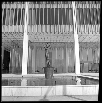 View of Passo di Danza bronze sculpture by Giacomo Manzu displayed in front of the Michigan Consolidated Gas/One Woodward building.