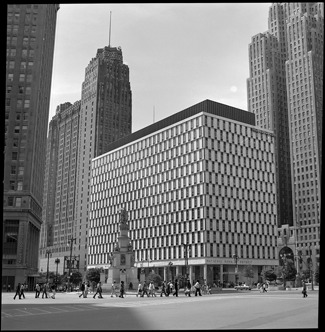 View of Soldiers' and Sailors' Monument. National Bank of Detroit building, designed by Albert Kahn Associates, in background. The Guardian Building is visible on the left.