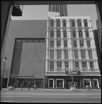 View of pedestrians walking in front of Hughes & Hatcher and B. Siegel stores.