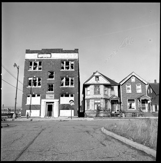 View of abandoned brick apartment building with broken windows adjacent to wooden-frame house and house with simulated brick siding. "Furnished apts. 2 and 4 rooms, weekly or monthly" sign displayed on building facade.