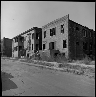 View of abandoned brick apartment buildings with broken windows.
