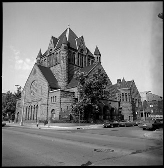 View of First Presbyterian Church, located on Woodward Avenue. Richardsonian Romanesque church was designed by Mason and Rice.