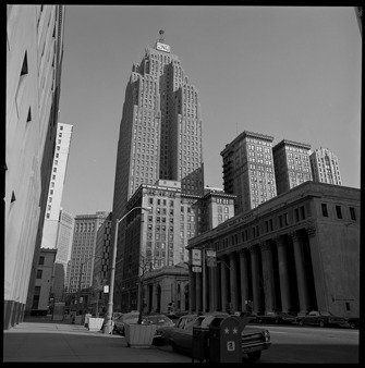 View of Penobscot Building with Detroit Bank & Trust building in foreground. The Detroit Bank & Trust building, formerly the Detroit Trust Company, was designed by Albert Kahn. Penobscot Building was designed by Smith, Hinchman and Grylls.