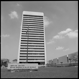 View of Blue Cross/Blue Shield of Michigan building, located at Lafayette and St. Antoine. Building was designed by Giffels and Rossetti. Flagpole and "Service Center, Blue Cross & Blue Shield" sign displayed on lawn.
