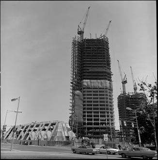 View of the Renaissance Center during construction. Automobiles waiting at traffic light in foreground.