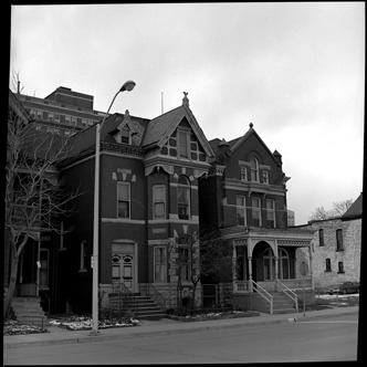 View of two adjacent two-story brick Gothic revival style houses. House on right has covered entry porch; house numbers are "128" and "122."