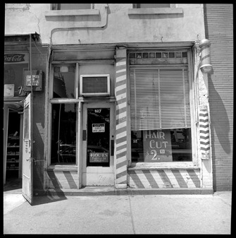 View of barbershop. Barber poles on building facade; "Hair cut, $2.75," "Sorry, we're closed until July 7th," and "Hours 7:45 - 4:30 week days" displayed on storefront windows.