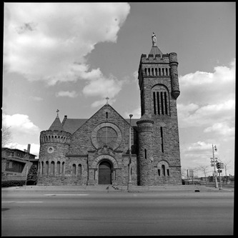 View of Holy Rosary Roman Catholic Church, formerly St. Joseph Episcopal Church, located on Woodward Avenue. Richardsonian Romanesque style church was designed by Malcomson and Higginbotham.