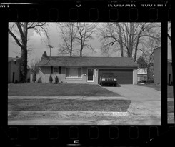 View of one-story brick ranch house with attached garage. Automobile parked in driveway.