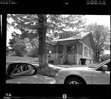 Front and side view of wooden-frame house with covered entry porch. American flag displayed on porch column; reflection of photographer in side mirror of automobile in foreground.