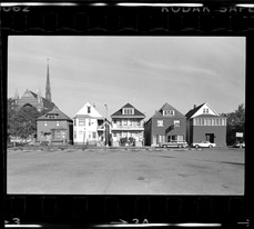 View of row of two-story houses on city block in Hamtramck. Car and station wagon parked on street; St. Florian Church in background.