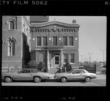 View of two-story brick Sisters of Notre Dame convent building adjacent to the St. Mary Catholic Church. Two cars parked in street.