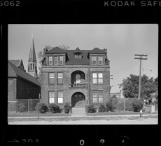View of the convent for Sainte Anne de Detroit, located on Lafayette between 18th Street and Ste. Anne Street. Building has arched covered entry porch and roof dormers. Church steeple in background.