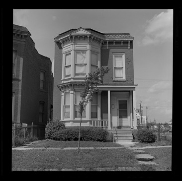 View of two-story brick house with bay windows, eave brackets and covered entry porch. Tiger Stadium in background.
