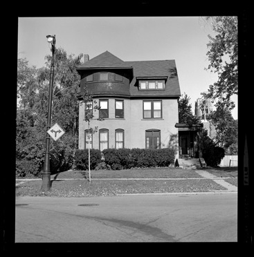 View of the Eugene Deimel residence, located at 874 Iroquois (formerly 192) in the Indian Village neighborhood. Three-story house has curved roof dormer and side covered entry porch.