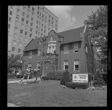 View of Children's Museum, located on Kirby Street. "Silverbolt" sculpture by John Kearney and "Children's Museum, Detroit Public Schools" sign on front lawn.