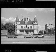 View of Frank J. Hecker house, located on Woodward Avenue. Chateauesque style house was designed by Louis Kamper. "Smiley Bros., pianos, organs" signs displayed on facade and front lawn; cars parked in front of building.