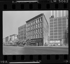 View of stores in row of commercial buildings. Signs for Conn's, Arthur's Clothes, Sex & Sin Boutique, Eastern Wigs and Wormser on buildings.