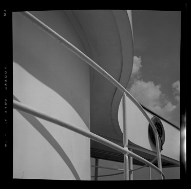 Close-up view of railing and life preserver on deck of the ferry "Ste. Claire" en route to Bob-Lo Amusement Park and Bob-Lo Island.