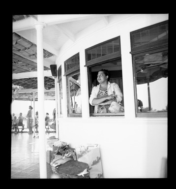 View of woman, standing with folded arms, on deck of ferry en route to Bob-Lo Amusement Park and Bob-Lo Island. Picnic baskets and tote bags rest against wall.