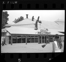 View of Bob-Lo Terrace restaurant at Bob-Lo Amusement Park. "Chicken in box, hamburgers, ice cold drink, fish sandwich, hot dogs, ice cream" painted in windows. Woman holding broom stands in foreground.