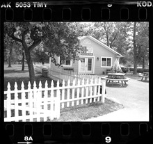View of Fudge Factory concession stand on Bob-Lo Island. Picnic table with umbrella and picket fence in foreground.